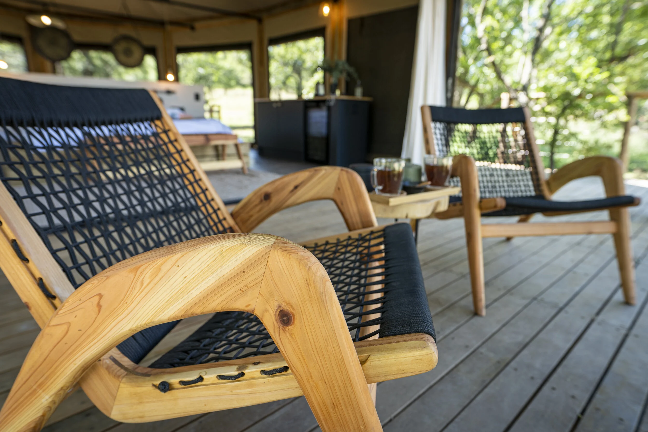 Luxury tent with bed, open view, deck chairs, tree, and pool on wooden deck in a natural setting.
