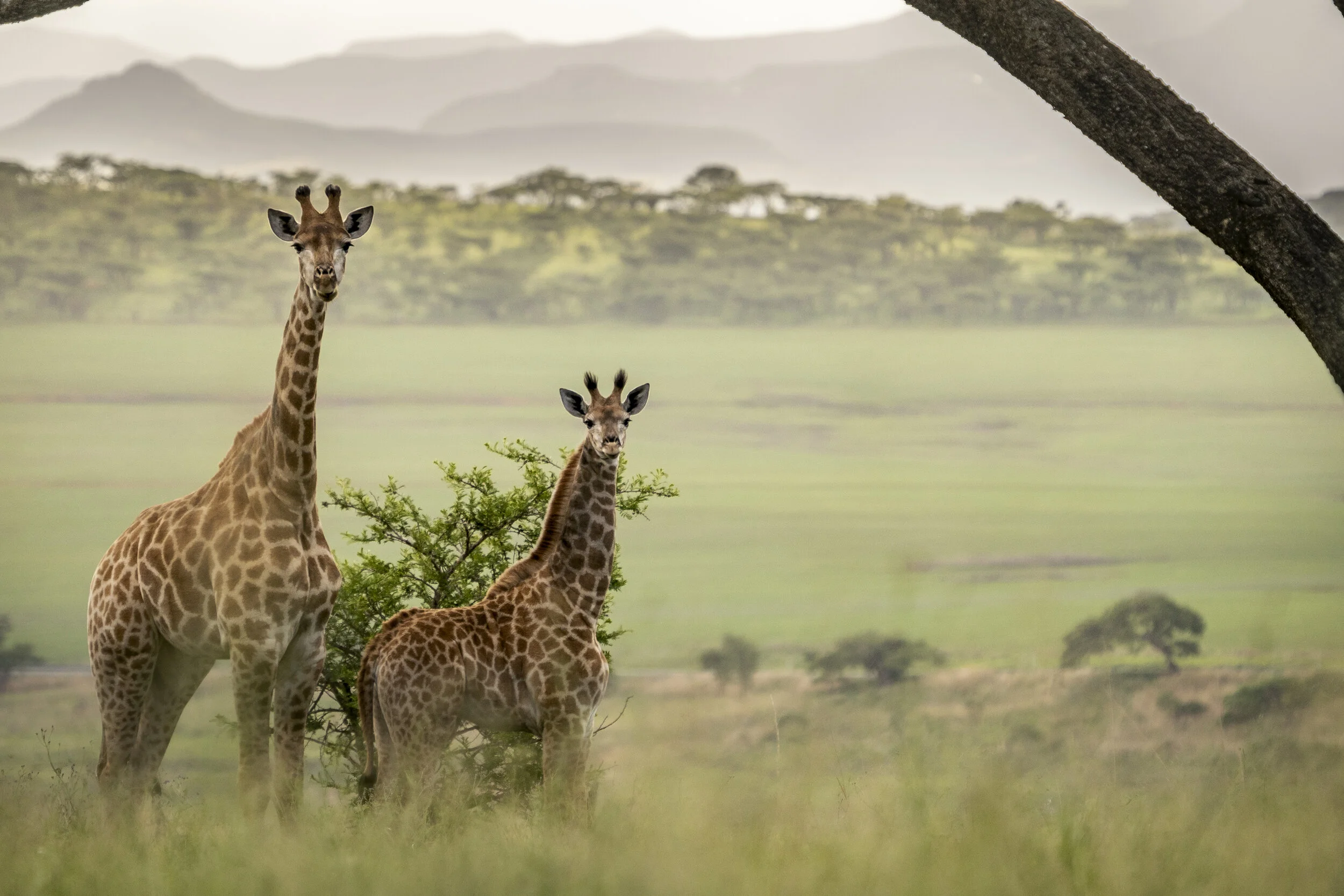 Two giraffes standing in a grassy savannah with trees and mountains in the background.