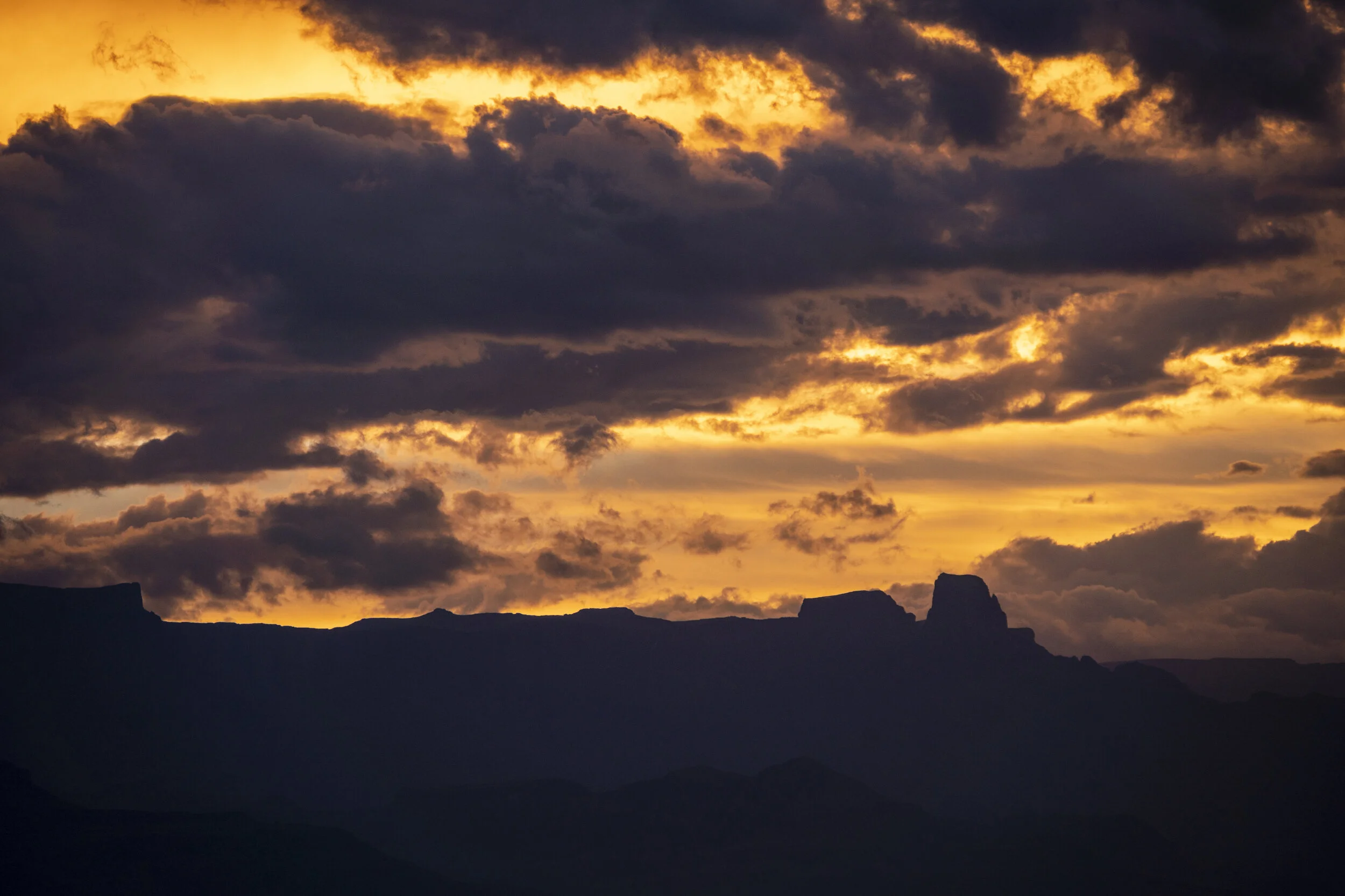 Silhouette of mountains against a dramatic sunset sky with clouds.